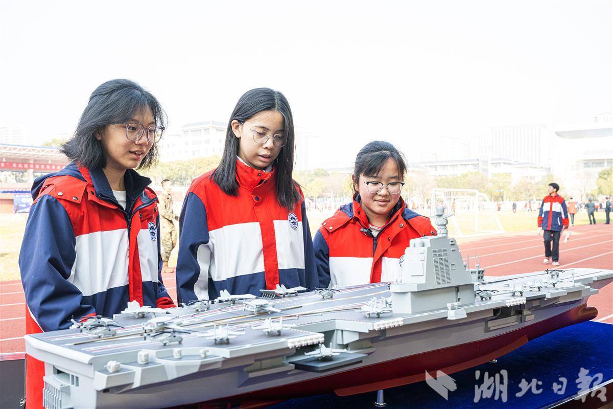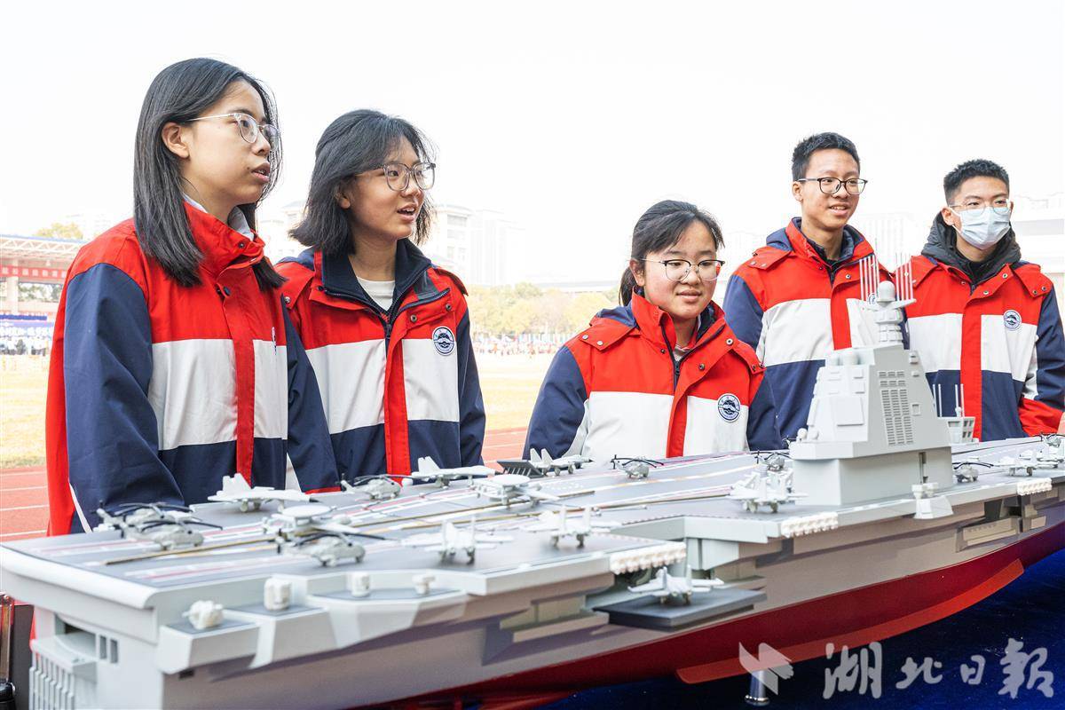 1襄阳五中高一学生徐美依(右三)和同学们在福建舰模型前驻足良久,希望将来自己也能有机会参与国防事业。(湖北日报全媒记者 任勇 曾雅青 通讯员 曹翰文 肖云飞 摄)