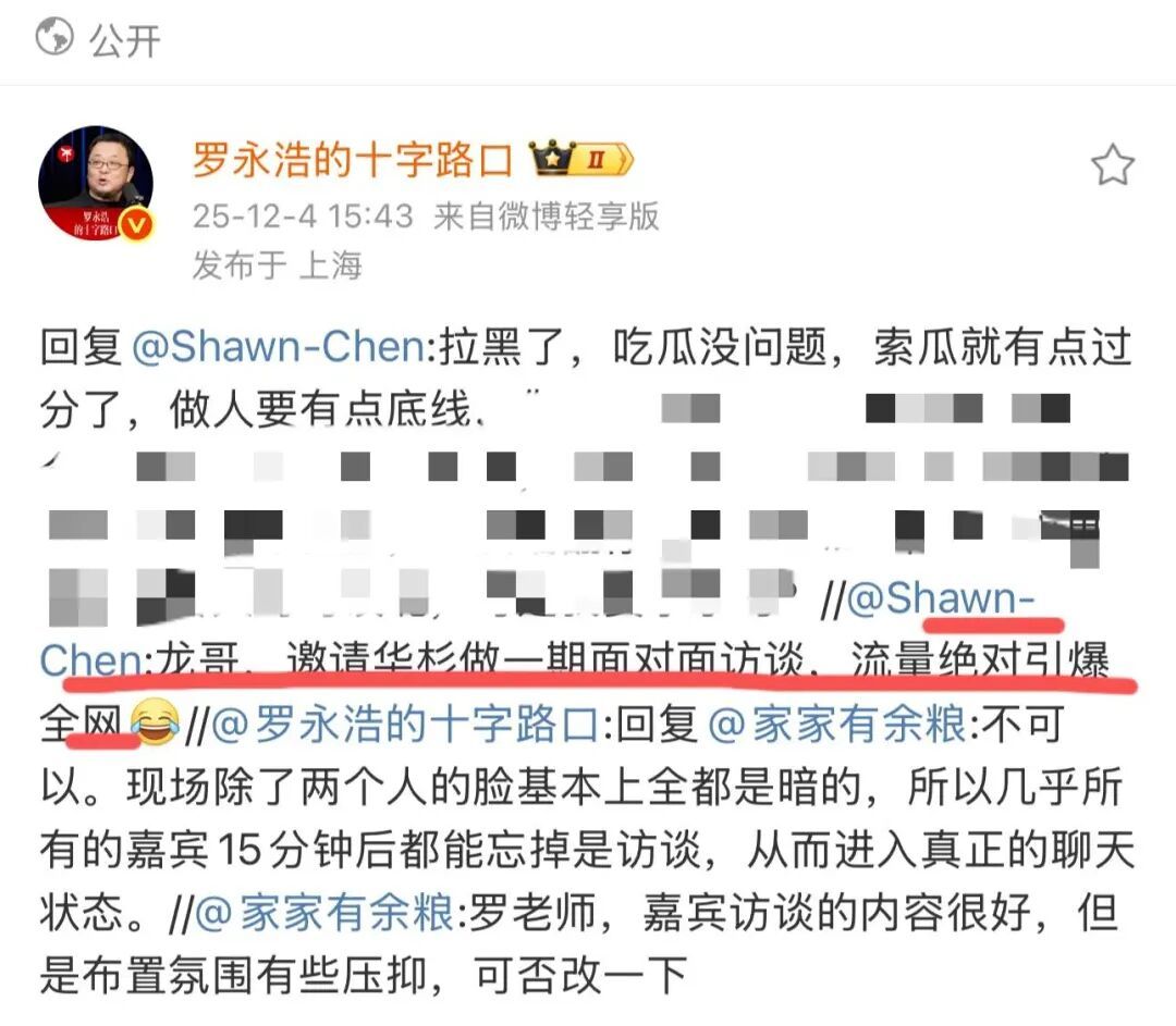 12月4日下午,罗永浩在社交平台发布一条产品广告,配文“技术革命是谁都拦不住”,却因一条网友评论引发新的争议。有昵称“Shawn-Chen”的网友留言建议:“邀请华杉做一期面对面访谈,流量绝对引爆全网。”