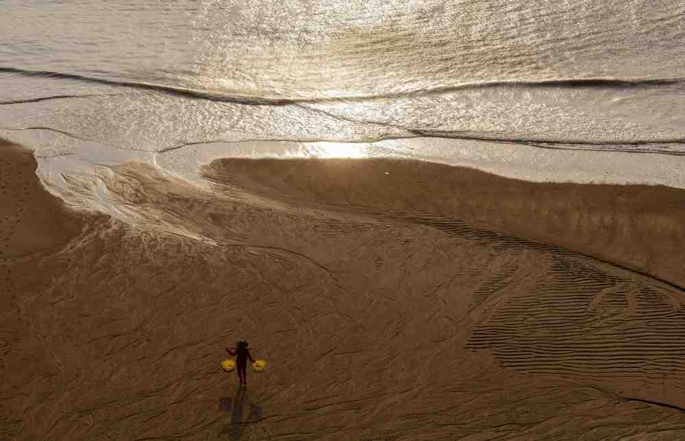 12月3日,在福建宁德霞浦县三沙镇东壁村,一名“渔模”在滩涂上行走。