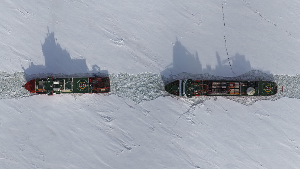 这是“雪龙”号(右)与“雪龙2”号(12月5日摄,无人机照片)。