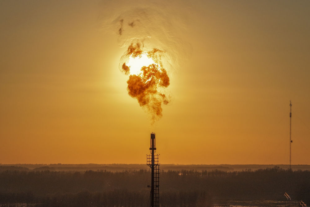 这是12月4日在黑龙江省大庆市杜尔伯特蒙古族自治县境内大庆古龙陆相页岩油国家级示范区拍摄的古页1号站放空火炬(无人机照片)。