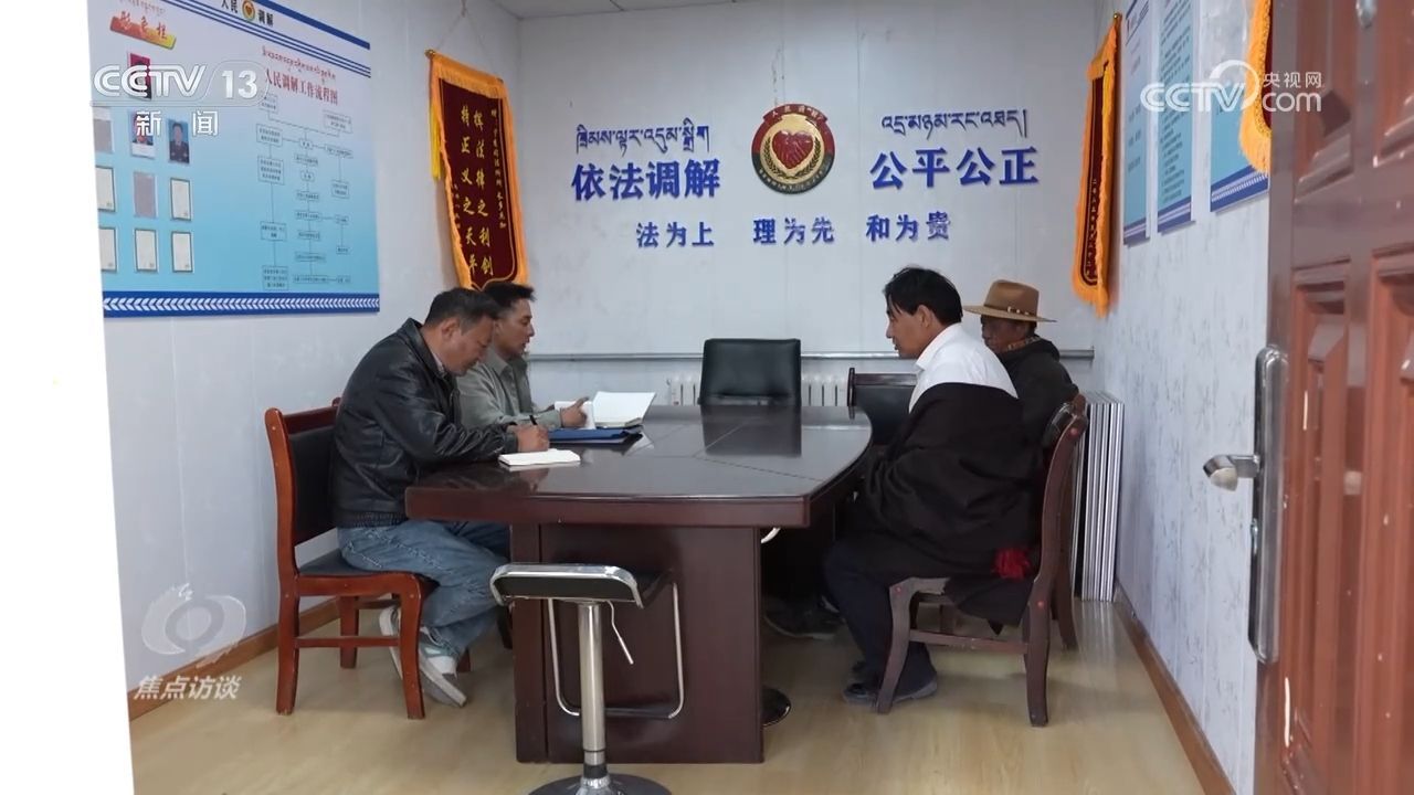 在青海泽库县宁秀司法所的调解室里,“法律明白人”索南才旦正在调解两名牧民的牛羊买卖合同纠纷。