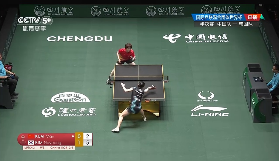 第四场女双比赛,蒯曼/王曼昱1-1战平李恩惠/崔孝珠,两局比分为:5-11、14-12。最终,中国队大比分8-3击败韩国队。