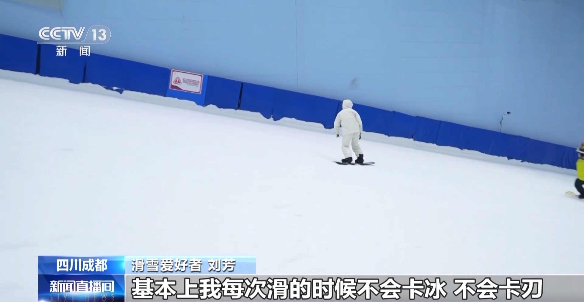 滑雪爱好者 刘芳:我经常周末都会到这来滑雪,这雪道又特别好,基本上我每次滑的时候不会卡冰、不会卡刃。