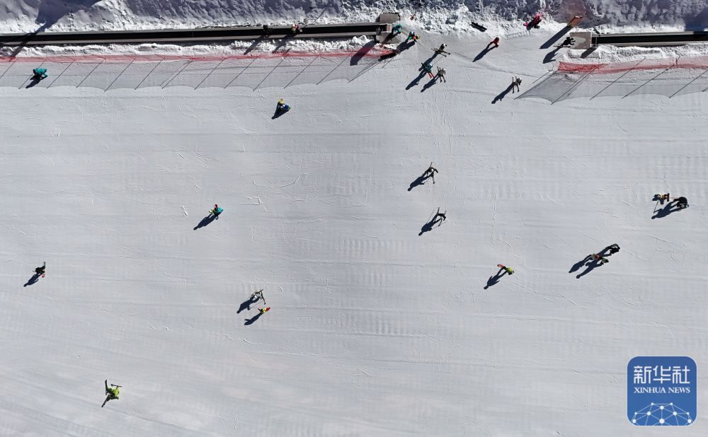 ↑ 在汶川羌人谷滑雪场,众多滑雪爱好者在雪道顶准备出发(无人机照片)。