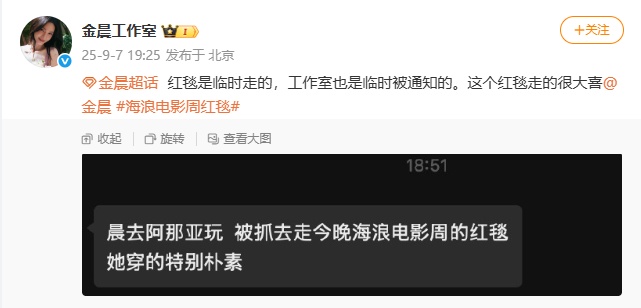随后其工作室发文透露,金晨去阿那亚玩,临时被抓去走红毯,“这个红毯走得很大喜”。对此,网友调侃怪不得金晨小跑离开的样子洋溢着下班的快乐。