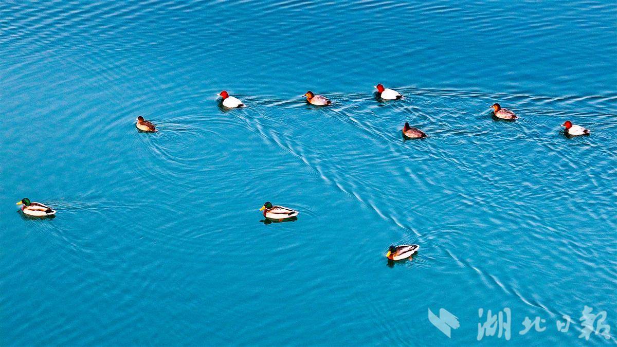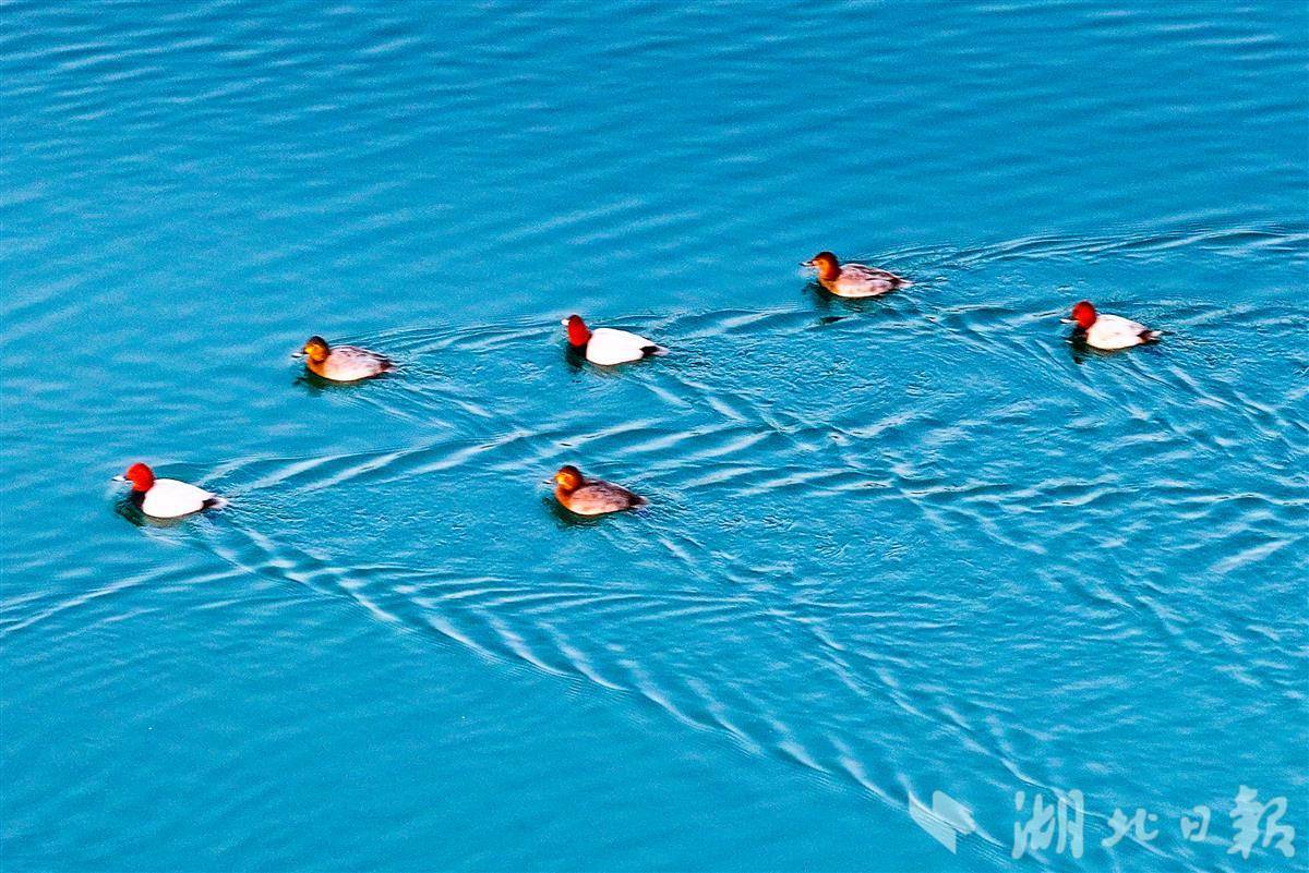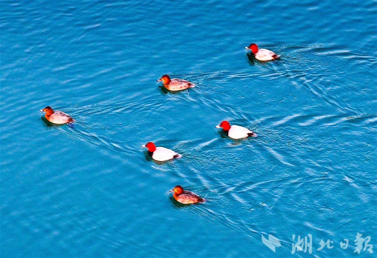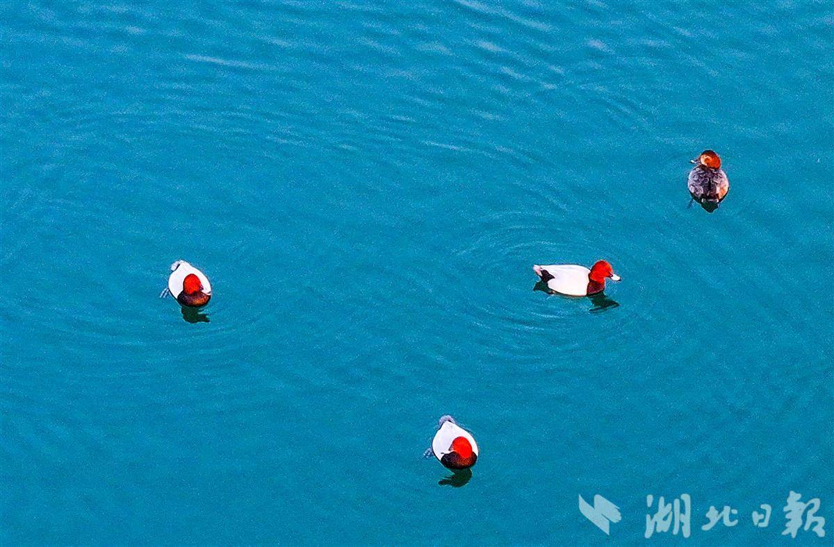 12月5日,十堰市郧阳湖国家湿地公园内,十几只红头潜鸭在觅食嬉戏。郧阳湖国家湿地公园为南水北调中线工程核心水源涵养地,生态水域面积1743.6公顷,其中湿地面积1404.09公顷。近年来,郧阳区坚持“共抓大保护 不搞大开发”理念,加大湿地保护和修复力度,良好生态吸引骨顶鸡、斑嘴鸭、苍鹭等鸟类在郧阳湖“安家”。目前,郧阳湖已发现鸟类64种,数量超过1.4万只,越冬候鸟种类和种群数量不断增加。(视界网 周家山 摄)