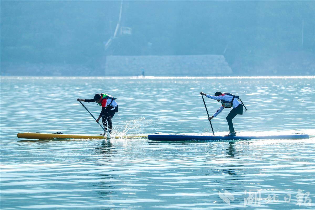12月6日,桨板参赛选手在秭归县水田坝乡三峡橙谷·吒溪河景区水域挥浆争先。