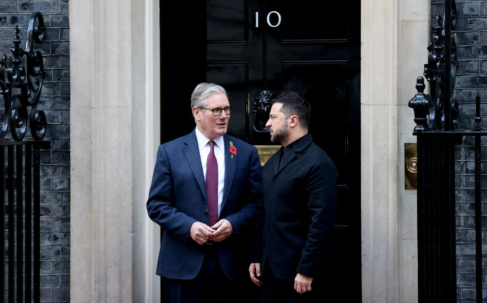 10月24日,在英国伦敦唐宁街10号首相府前,英国首相斯塔默(左)与到访的乌克兰总统泽连斯基交谈。新华社记者李颖摄