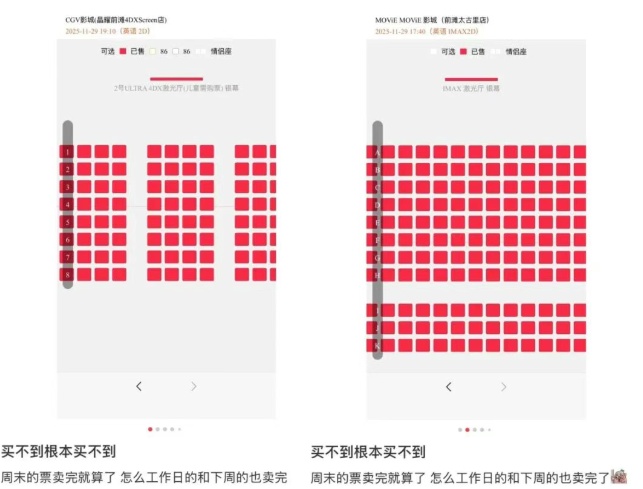 有网友发帖称,多个影院多个时段的票“买不到根本买不到”。