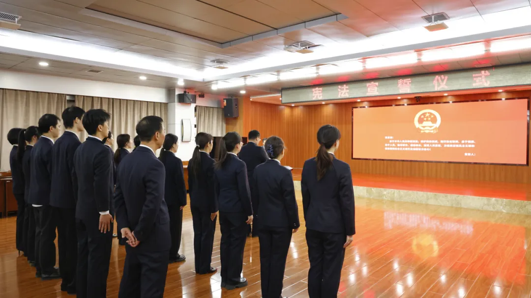 12月4日,武昌区人民检察院组织开展宪法宣誓仪式系列活动。全院新晋职及新进检察人员身着统一制服,精神抖擞,列队肃立,奏唱中华人民共和国国歌,激昂的旋律激发着每一位干警的爱国热情和法治理想。全体宣誓人员面向鲜艳的五星红旗,高举右拳,作出庄严承诺。誓言字字千钧、掷地有声,展现了武昌检察人对宪法的忠诚敬畏和捍卫公平正义的坚定决心。