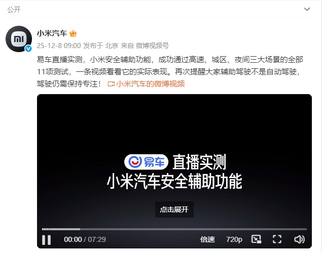 12月8日,小米汽车发文:易车直播实测,小米安全辅助功能,成功通过高速、城区、夜间三大场景的全部11项测试,一条视频看看它的实际表现。再次提醒大家辅助驾驶不是自动驾驶,驾驶仍需保持专注!