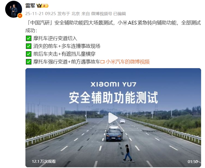 11月21日,小米创办人、董事长兼CEO雷军宣布,中国汽研安全辅助功能四大场景测试,小米AES紧急转向辅助功能,全部测试成功。