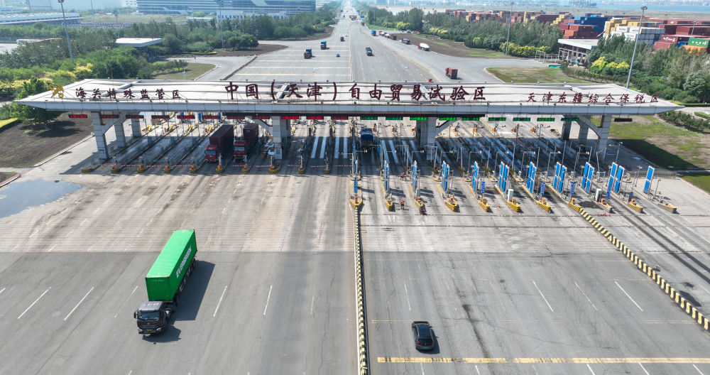 这是6月20日拍摄的天津自贸区天津港东疆片区入口处的中国(天津)自由贸易试验区海关特殊监管区入口(无人机照片)。新华社记者 孙凡越 摄