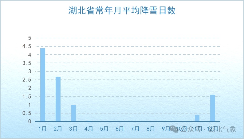 湖北常年月平均降雪日数排行(1991—2020年):1月>2月>12月>3月>11月>4月