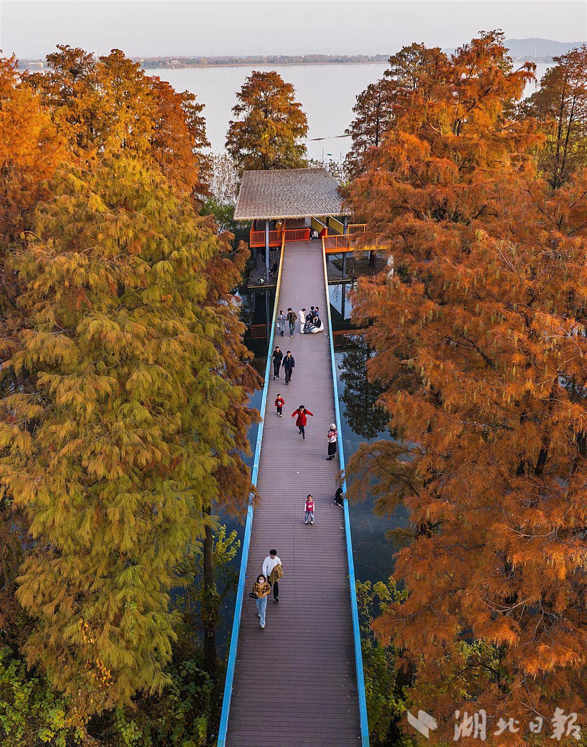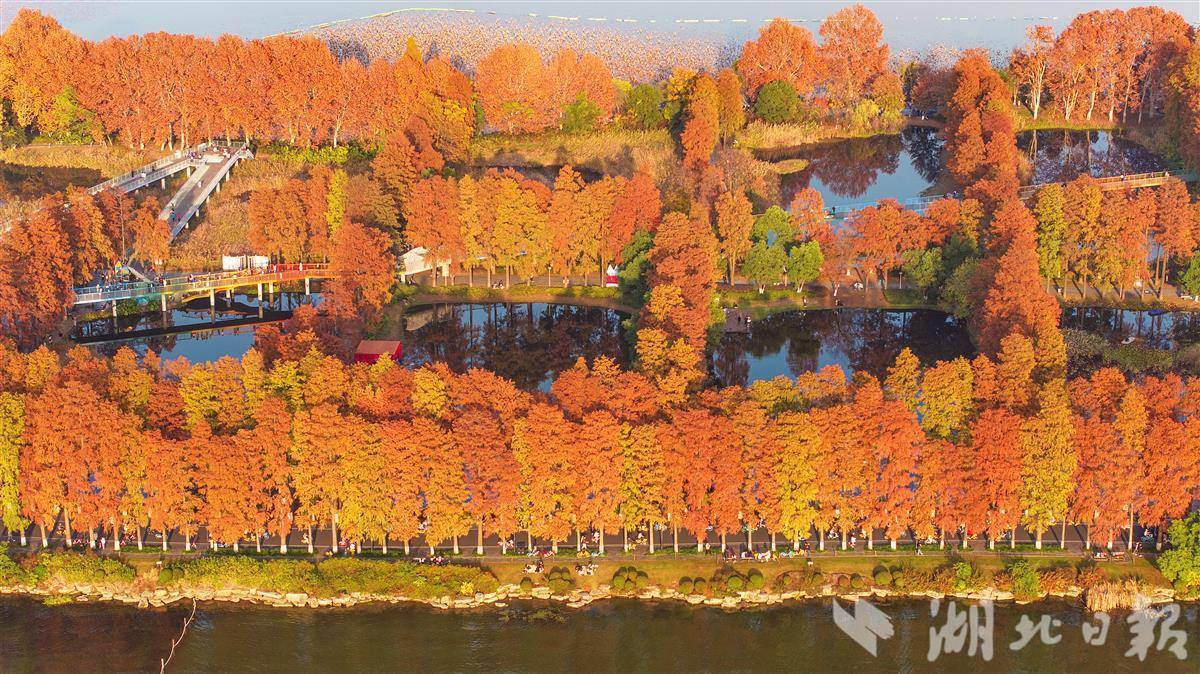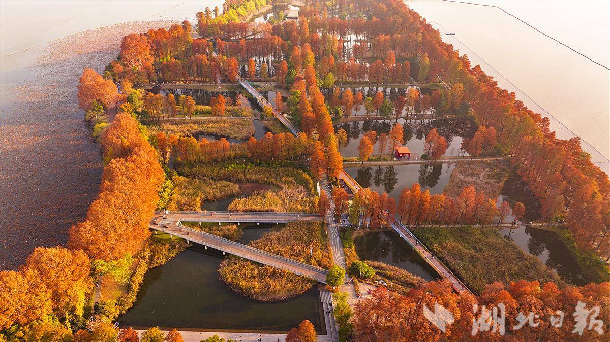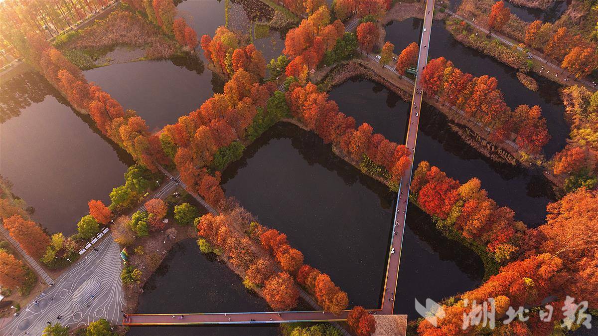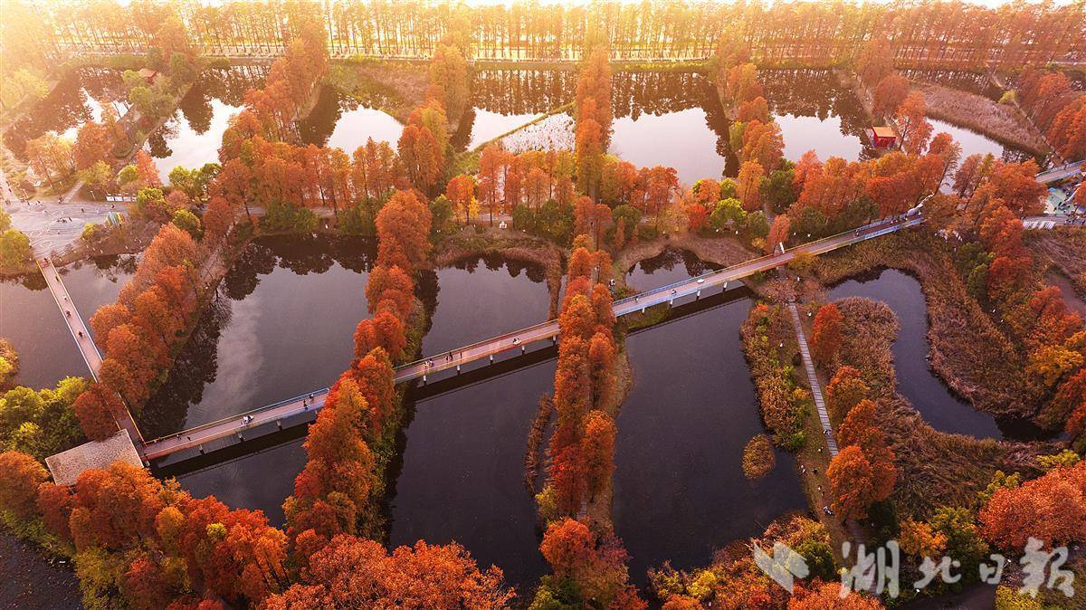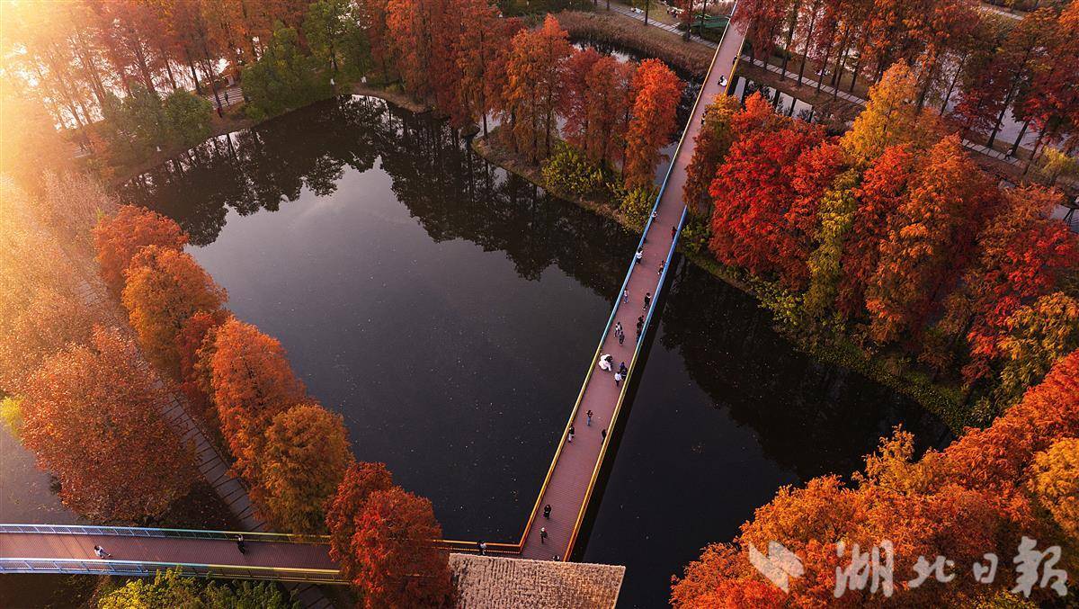 近日,武汉华侨城生态湿地公园内层林尽染,彩虹桥、水榭、亭池、杉树和梧桐树倒影在水中,市民游客或徒步或骑行在如画的美景里。