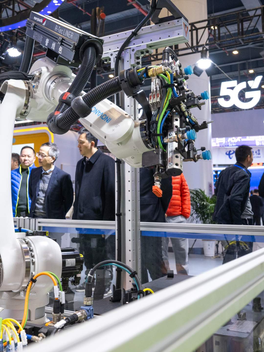 2025中国5G+工业互联网大会在武汉举办,参观者观看一款柔性制造岛式工作站。新华社记者肖艺九 摄
