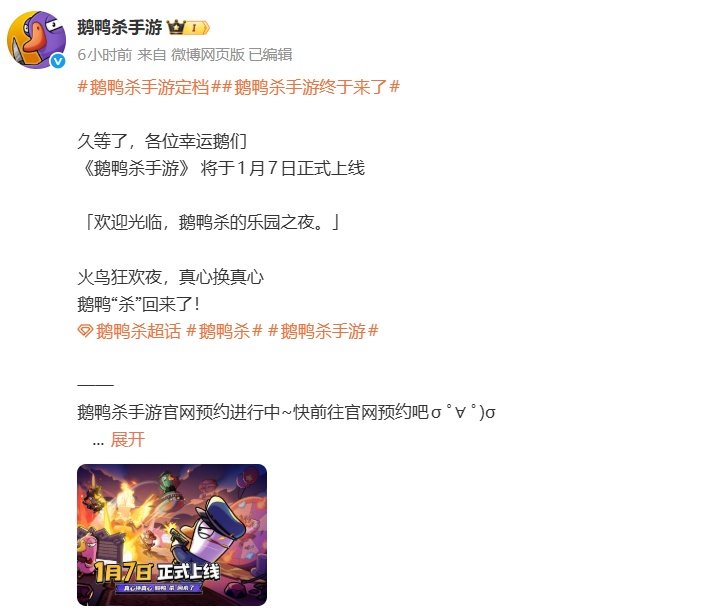 12月8日,《鹅鸭杀》手游官宣将于2026年1月7日正式上线。据介绍,全网预约量目前已突破1000万。