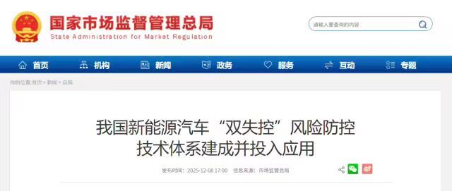 据国家市场监管总局官网12月8日消息,针对新能源汽车热失控和速度失控构成的“双失控”行业痛点,市场监管总局组织国内优势科研力量,通过“双失控”事故深度调查与缺陷判定技术研发,结合“线上预警 + 线下检测”一体化风险防控机制,加之“新能源汽车智慧监管云平台”的统筹赋能,构建起新能源汽车“双失控”风险防控技术体系并投入应用,为提升召回监管科学化水平、保障消费者人身和财产安全提供了技术支撑。