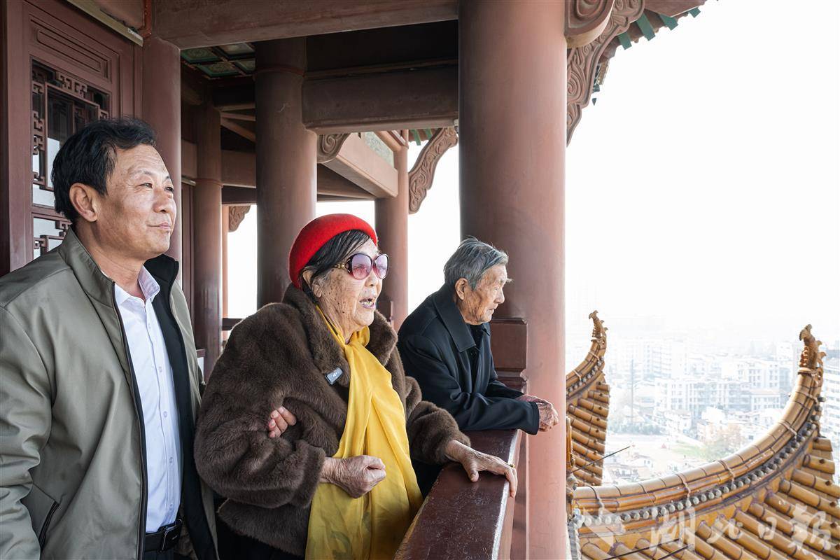12月8日,抗日时期革命烈士黄骅的小女儿黄鲁彬(中)和家人回到家乡湖北,第一次登上心心念念的黄鹤楼。(湖北日报全媒记者 任勇 王孝武 通讯员 江萌 摄)