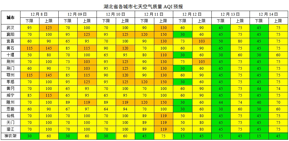湖北省各城市七天空气质量预报