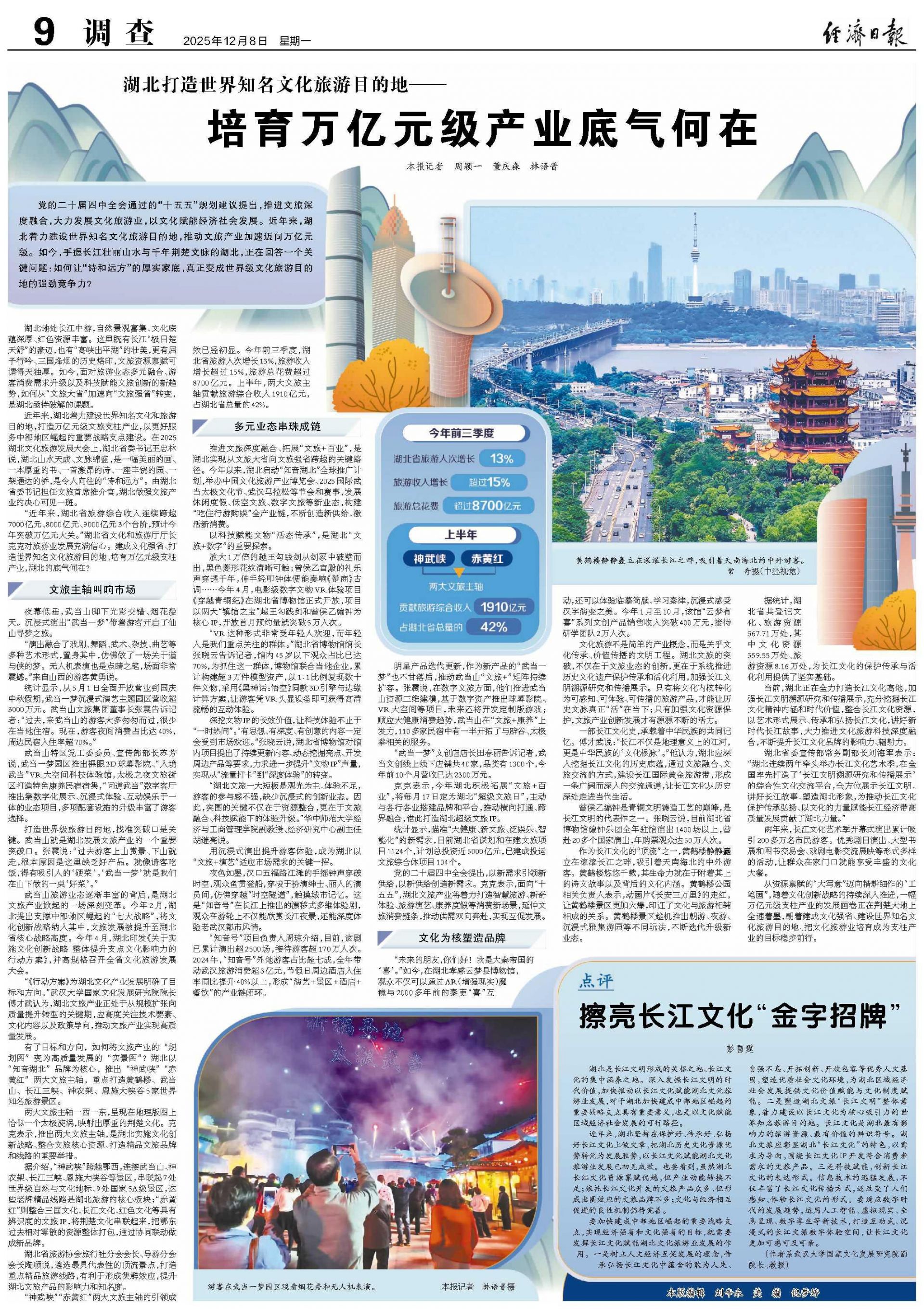 文化旅游不是简单的产业概念,而是关乎文化传承、价值传播的文明工程。湖北文旅的突破,不仅在于文旅业态的创新,更在于系统推进历史文化遗产保护传承和活化利用,加强长江文明溯源研究和传播展示。只有将文化内核转化为可感知、可体验、可传播的旅游产品,才能让历史文脉真正“活”在当下;只有加强文化资源保护,文旅产业创新发展才有源源不断的活力。