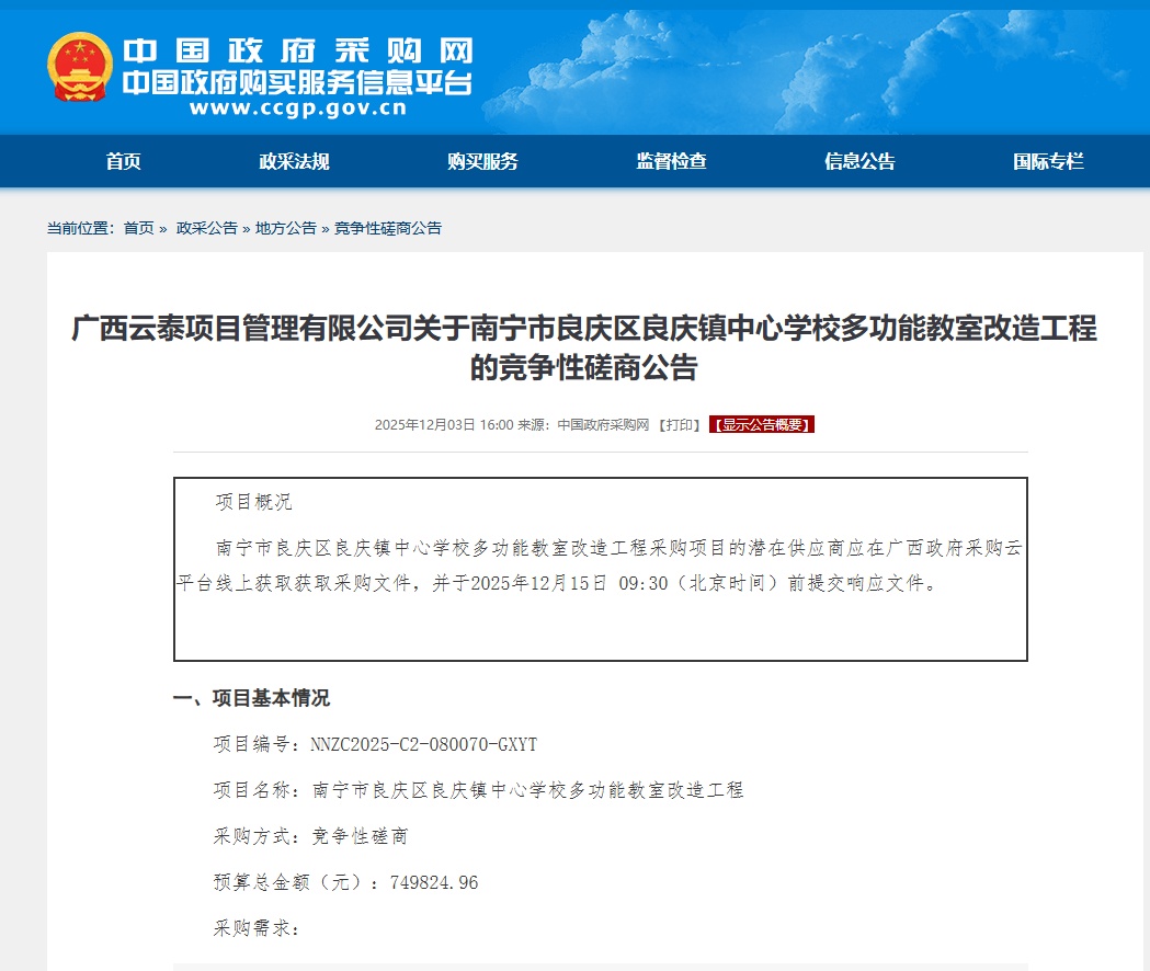 我公司于2025年1月3日下午在全国公共资源交易平台(广西·南宁)发布了“南宁市良庆区良庆镇中心学校多功能教室改造工程(项目编号:NNZC2025-C2-080070-GXYT)”的采购公告。