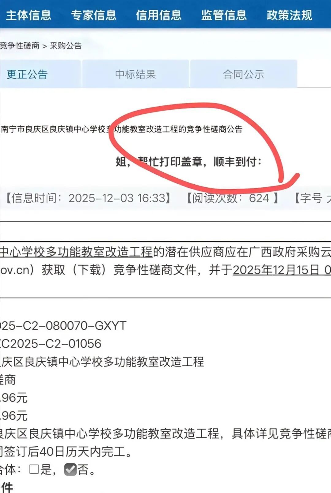 近日,有人反映南宁市良庆区良庆镇中心学校多功能教室改造采购项目在招标中,把公告标题写成“姐,帮忙打印盖章,顺丰到付”,随后又在半小时后发布更正公告。