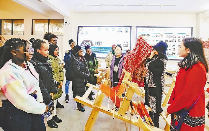 土家姐妹谭艳华(右一)、谭艳宾(右二)向外国留学生展示西兰卡普织锦技艺。 (受访者供图)