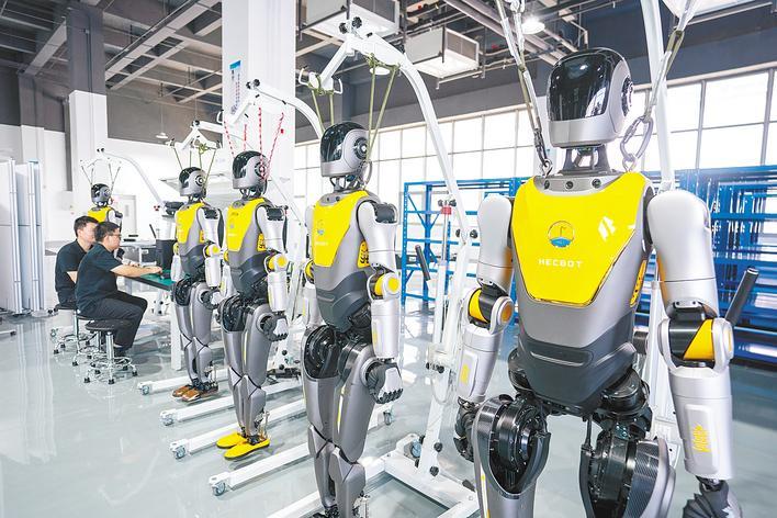 光谷筑芯科技产业园,光谷东智的机器人产线上,工程师正在检测机器人。(湖北日报全媒记者 魏铼 摄)