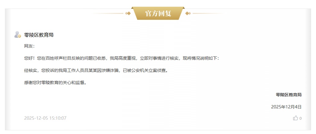 12月4日,永州市零陵区教育局对“投诉零陵区教育局工作人员收钱不办事”回复表示,该局高度重视,立即对事情进行核实。经核实,网友投诉的该局工作人员吕某某因涉嫌诈骗,已被公安机关立案侦查。