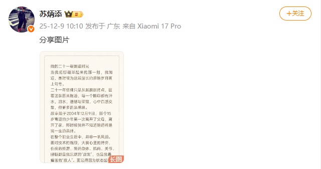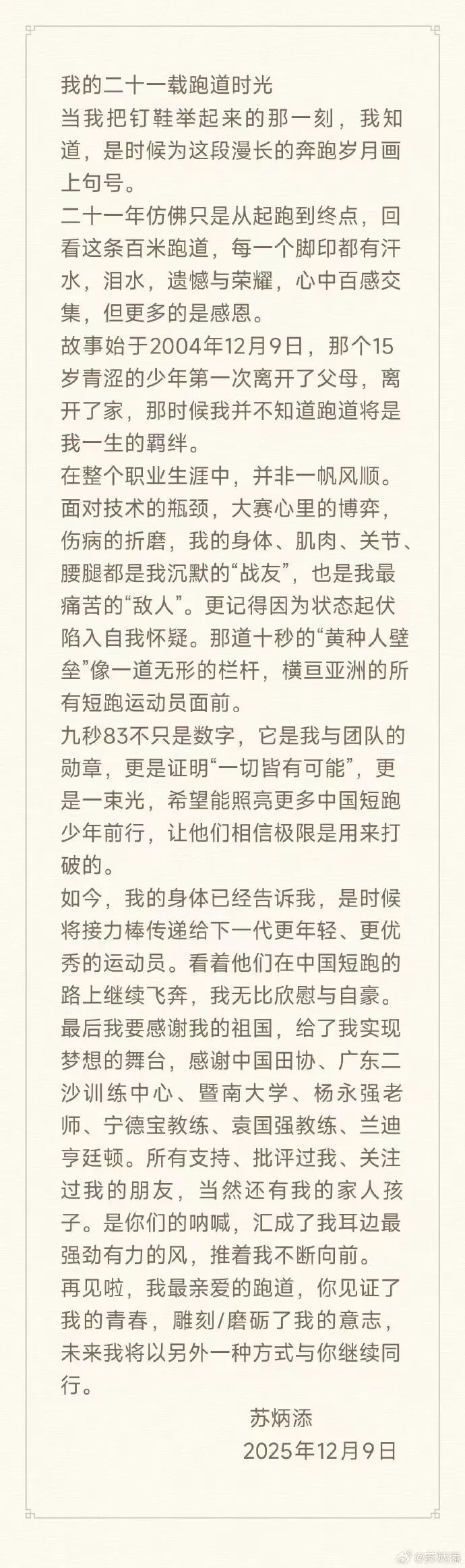 新华社广州12月9日电 男子100米亚洲纪录保持者、中国短跑名将苏炳添宣布退役。