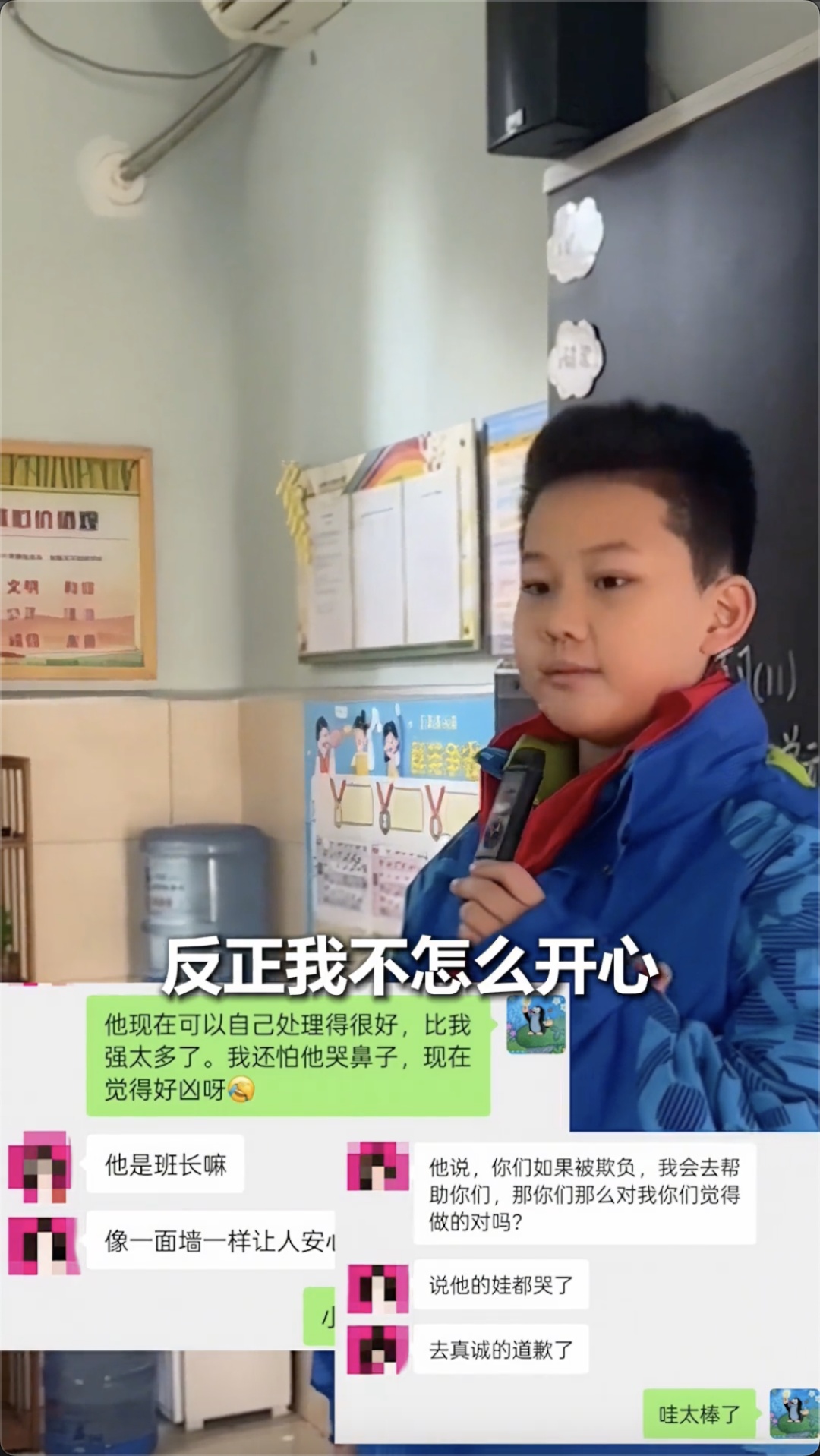 视频中,男孩在班会上