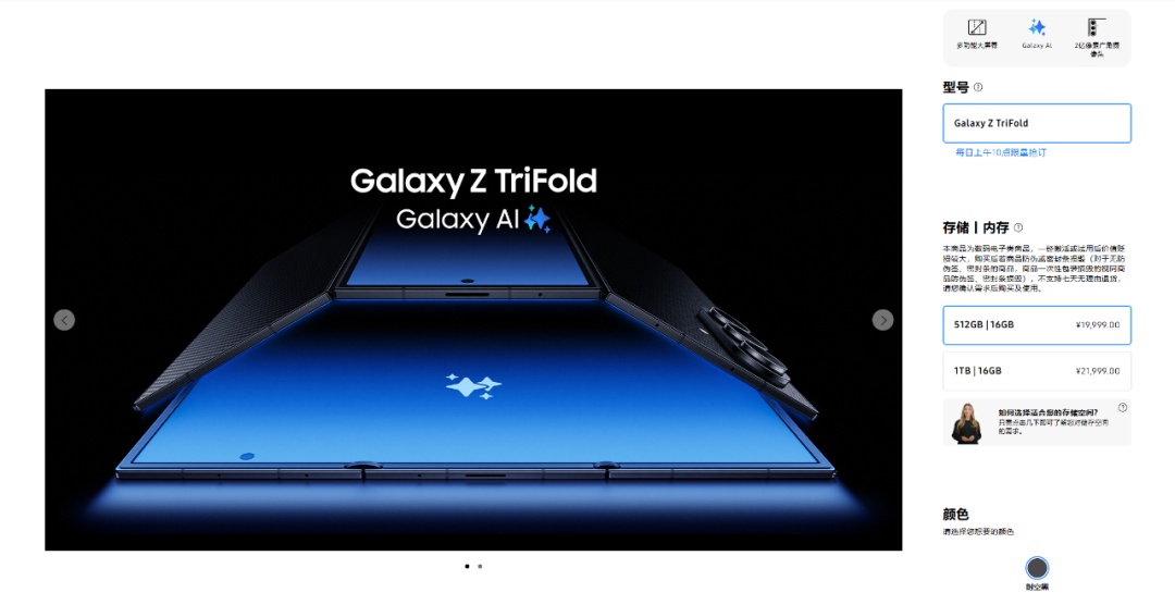 12月2日三星电子正式发布了三折叠手机 Galaxy Z TriFold,今日该机正式在国内开启预订,官网显示每日上午10点限量抢订,具体售价如下: