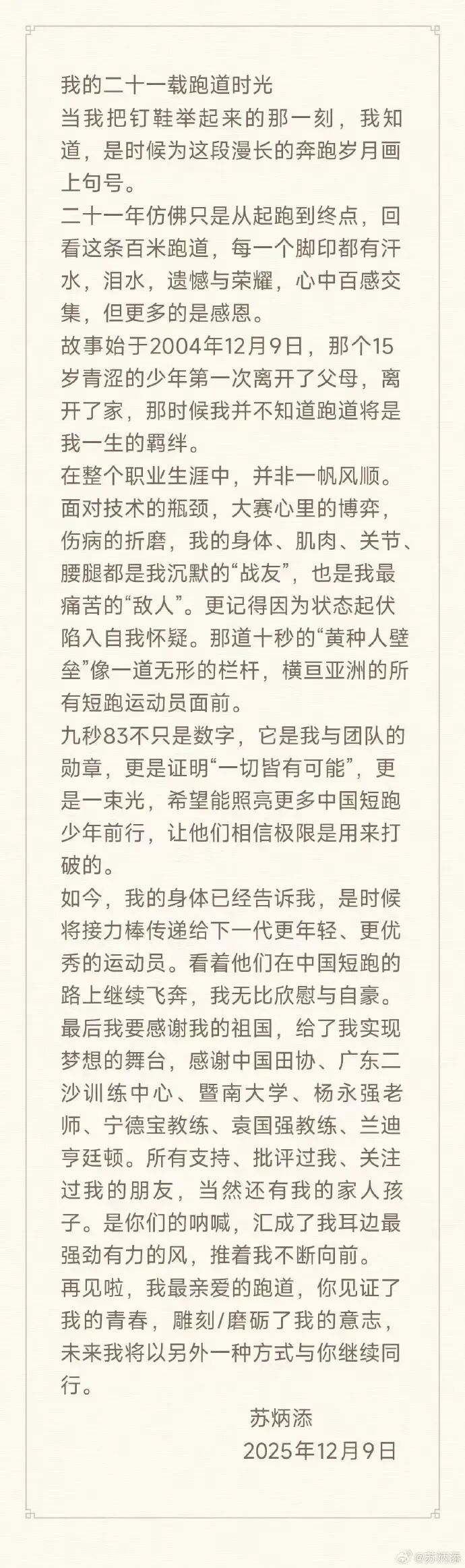 在发布的告别长文中,苏炳添回顾了自己的职业生涯,他说:“是时候为这段漫长的奔跑岁月画上句号。”此外,苏炳添还寄语自己的后辈们:“希望(9秒83)成为一束光,照亮更多的中国短跑少年前行。”