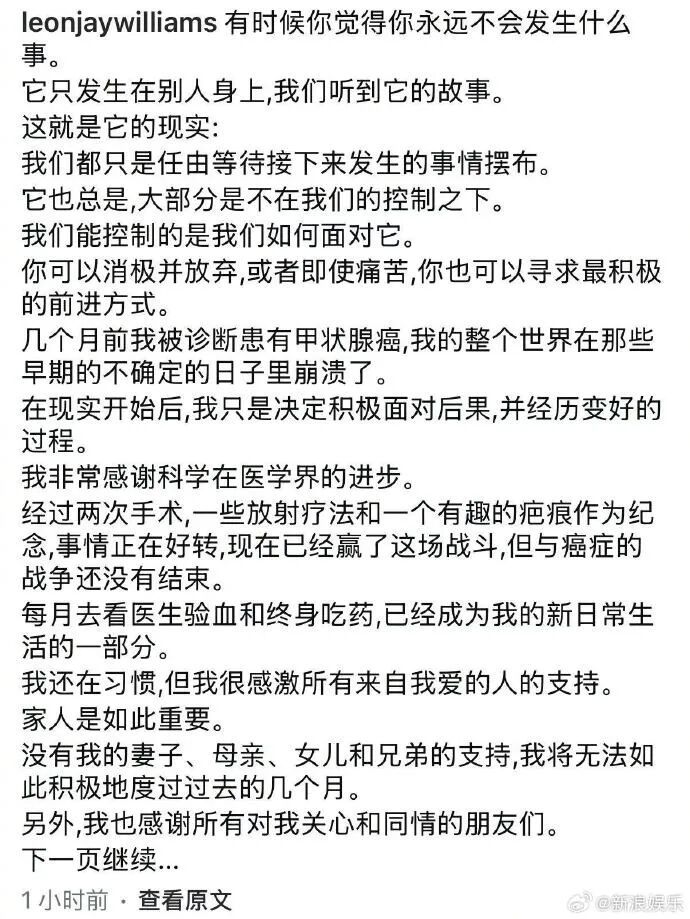 12月9日,演员立威廉在患甲状腺癌消息曝光后首发文,他表示在病情不明朗的初期,自己的世界都崩塌了,但还是决定积极面对。他经过两次手术,状况正在好转,“每月去看医生验血和终身吃药,已经成为了我的新日常生活的一部分”,并感谢家人和关心的朋友们的支持。