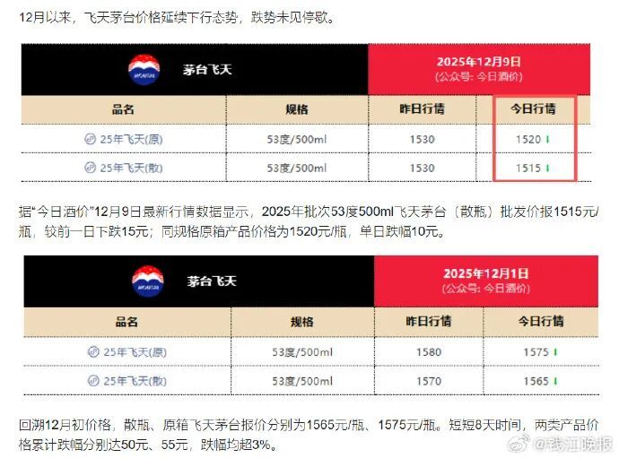 回溯12月初价格,散瓶、原箱飞天茅台报价分别为1565元/瓶、1575元/瓶。短短8天时间,两类产品价格累计跌幅分别达50元、55元,跌幅均超3%。