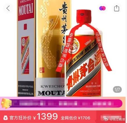 作为参考,该产品出厂价为1169元/瓶,官方市场指导价为1499元/瓶。记者在多家电商平台查询发现,目前散瓶飞天茅台通过拼团、补贴等促销方式,最低到手价仅1399元/瓶,较官方指导价低100元,正式击穿指导价防线。