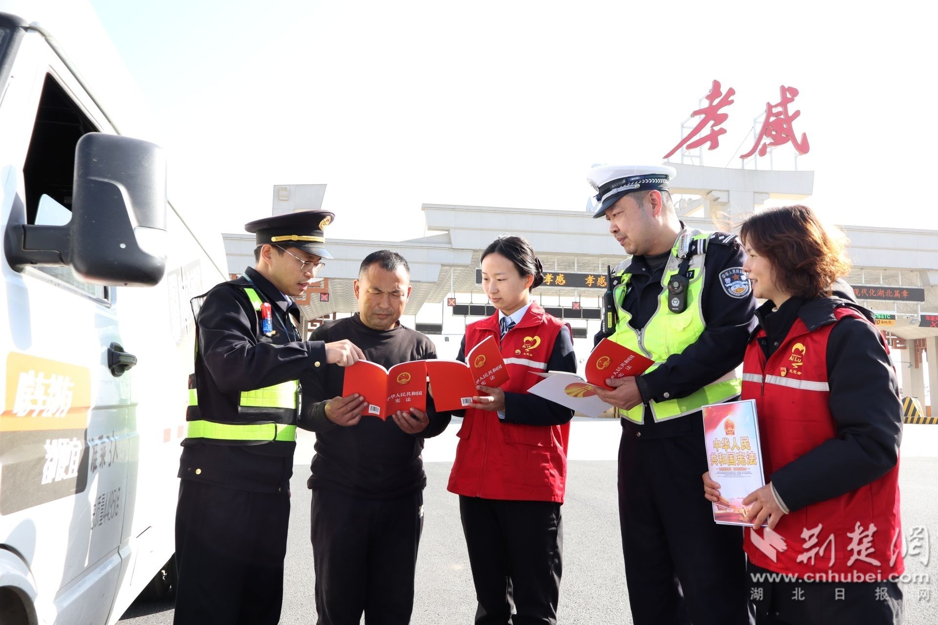 荆楚网(湖北日报网)讯(通讯员李晓鹏 谢威 郑冰倩)12月1日至7日,我国第八个“宪法宣传周”期间,围绕“学习宣传贯彻习近平法治思想,推动宪法深入人心”的活动主题,京港澳高速孝感收费站联合湖北高速交警孝感大队、省高速公路路政执法三支队二大队组建联合志愿服务队,在G4京港澳高速孝感收费站及沿线社区、企业开展多维度宪法宣传活动,让法治精神伴随往来车流传递至千家万户。