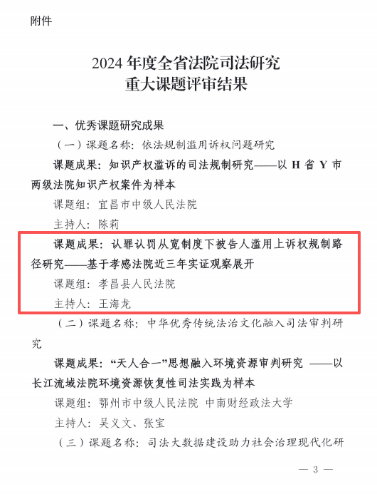 近期,湖北省高法院公布2024年度司法研究重大课题结项验收评审结果,孝昌县人民法院申报的《认罪认罚从宽制度下被告人滥用上诉权规制路径研究——基于孝感法院近三年实证观察展开》课题,经现场答辩评审及省法院党组会议研究审定,成功获评“优秀课题”。