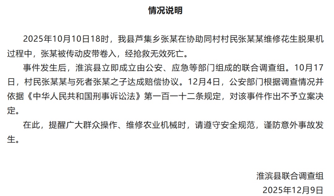 12月4日,公安部门根据调查情况并依据《中华人民共和国刑事诉讼法》第一百一十二条规定,对该事件作出不予立案决定。在此,提醒广大群众操作、维修农业机械时,请遵守安全规范,谨防意外事故发生。