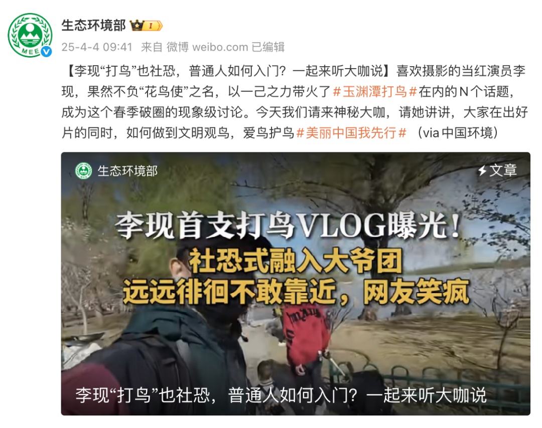 他带着相机去北京玉渊潭公园拍摄鸟类的日常被曝光后,相关话题登上热搜,并获生态环境部点赞。李现“打鸟”带动了公众对生态保护的关注,多地文旅纷纷喊话邀请他前往观鸟。