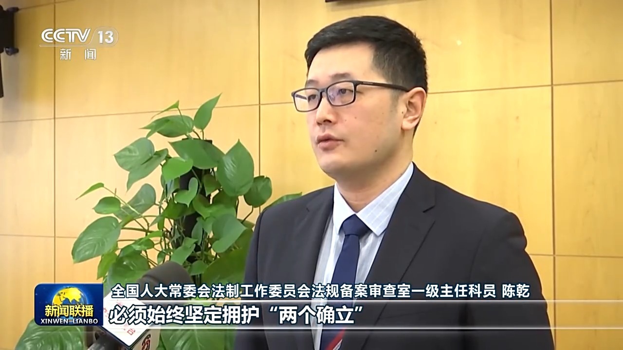 全国人大常委会法制工作委员会法规备案审查室一级主任科员 陈乾:“十五五”规划目标的实现,必须始终坚定拥护“两个确立”、坚决做到“两个维护”,要紧密结合自身岗位和人大工作实际,以高度的政治责任感、使命感,为全面贯彻党的二十届四中全会精神,提供坚实法治保障和根本政治制度保障。