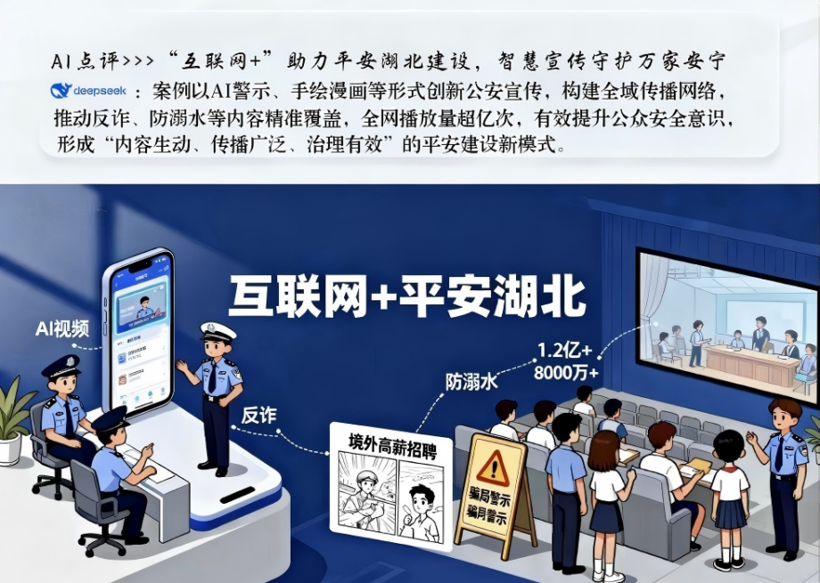湖北省公安厅为使安全宣传入脑入心,积极运用AI技术还原真实溺水场景,制作手绘科普漫画;结合热点案例制作警示短视频;针对“境外高薪招聘”骗局,及时推出深度报道和专业解读;制作防溺水AI警示视频、手绘长图等具有网络传播特性的精品内容,确保宣传既接地气又具专业性。通过精准、生动的宣传方式,增强了网民对安全风险的辨识能力。通过多样化形式实现警示性、知识性与趣味性的统一。