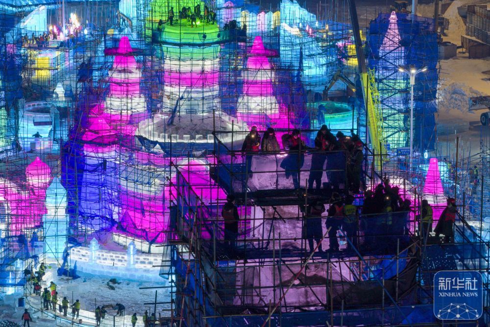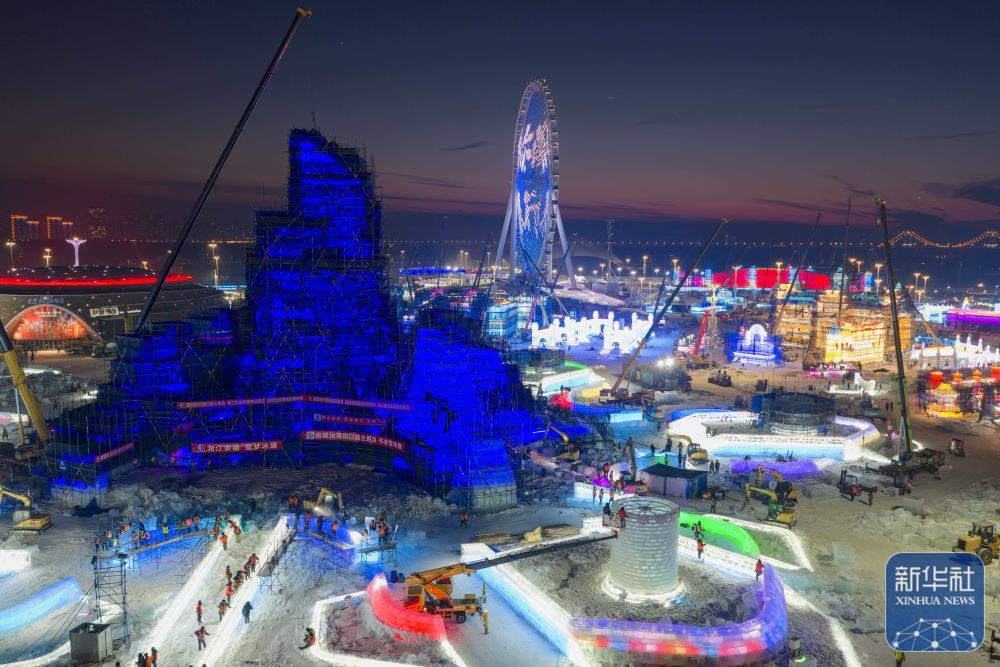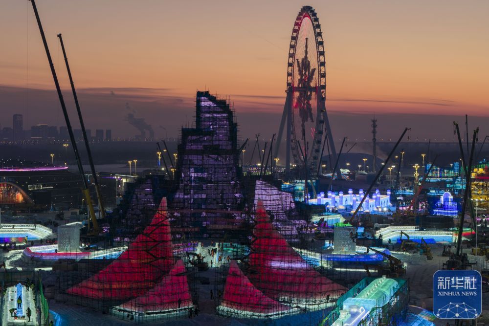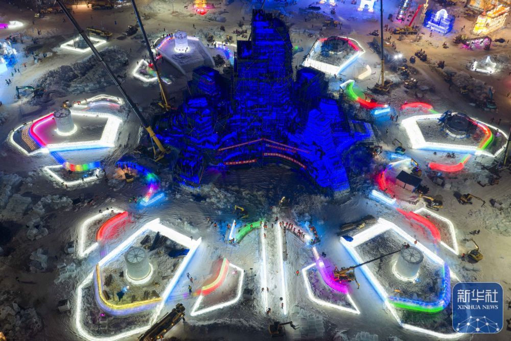 ↑ 12月10日,工人在哈尔滨冰雪大世界主塔施工现场(前)作业(无人机照片)。新华社记者 张涛 摄