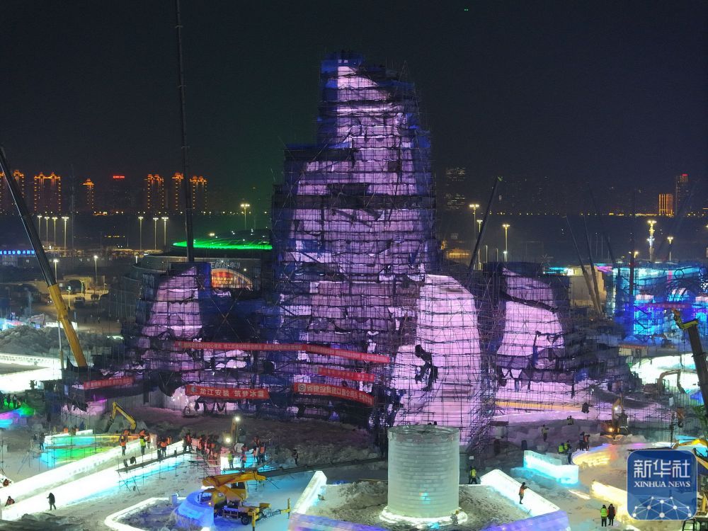 ↑ 这是12月10日拍摄的哈尔滨冰雪大世界主塔施工现场(无人机照片)。新华社记者 张涛 摄