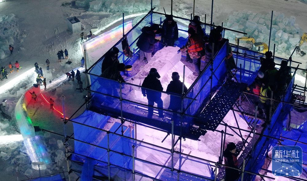 ↑ 12月10日,工人在哈尔滨冰雪大世界主塔施工现场作业(无人机照片)。新华社发(张树 摄)