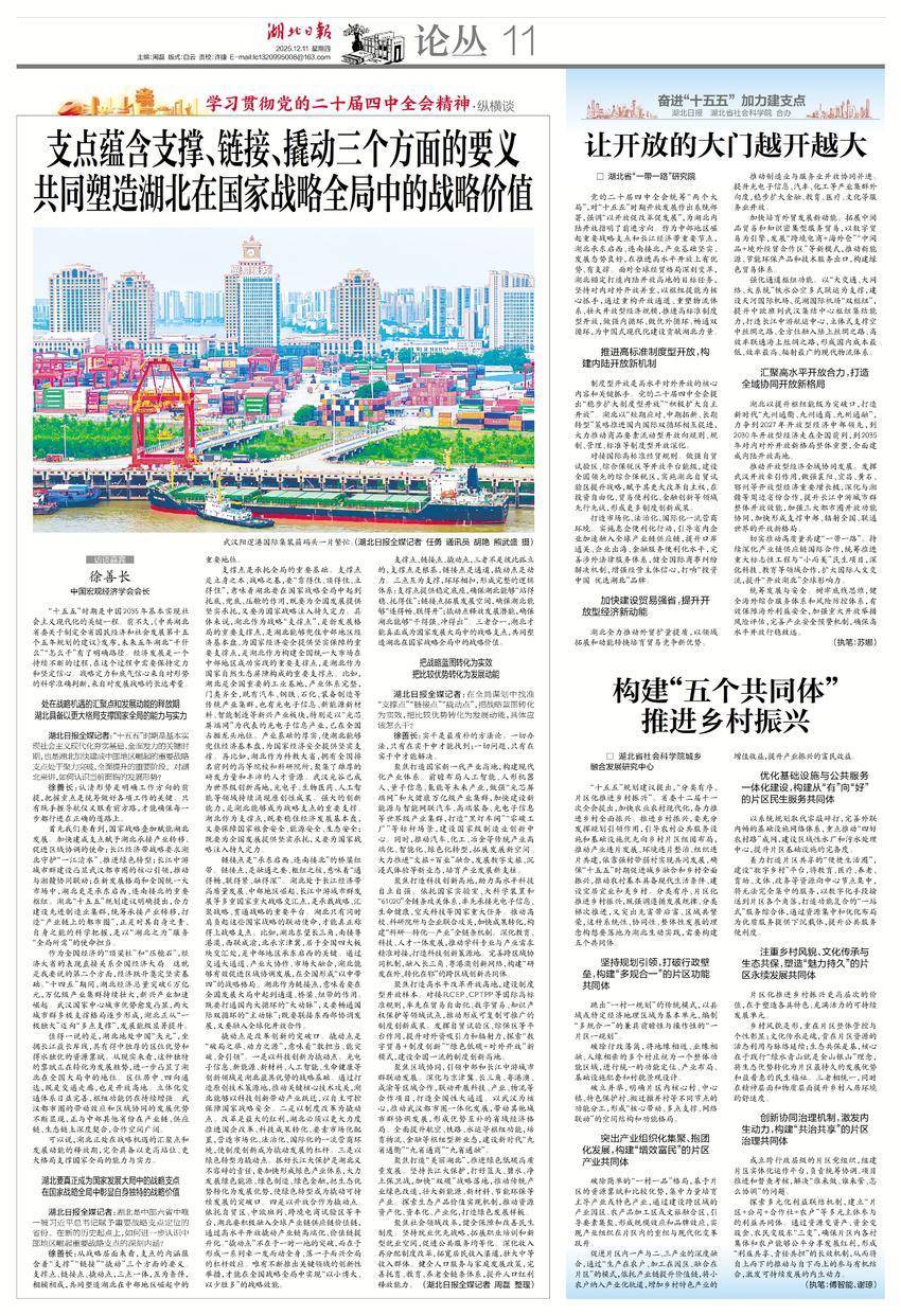 徐善长:从战略层面来看,支点的内涵蕴含着“支撑”“链接”“撬动”三个方面的要义。支撑点、链接点、撬动点,三点一体,互为条件,相辅相成,共同塑造湖北在中部地区崛起中的重要地位。