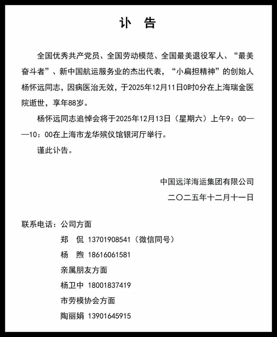 据中国远洋海运集团有限公司消息,全国优秀共产党员、全国劳动模范、全国最美退役军人、“最美奋斗者”、新中国航运服务业的杰出代表,“小扁担精神”的创始人杨怀远同志,因病医治无效,于2025年12月11日0时0分在上海瑞金医院逝世,享年88岁。