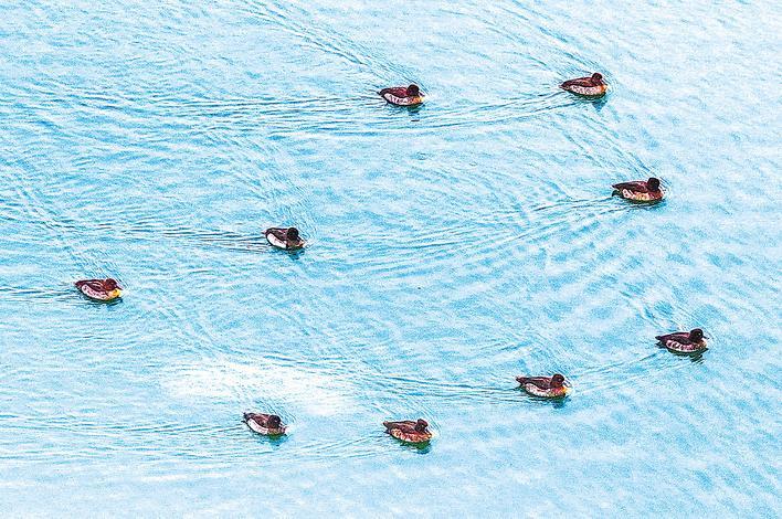 12月8日,十堰市郧阳湖国家湿地公园,十几只青头潜鸭在觅食嬉戏。